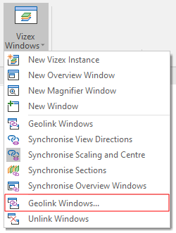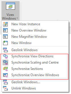 When geolinking is enabled, synchronisation options are enabled on the Vizex Windows menu: