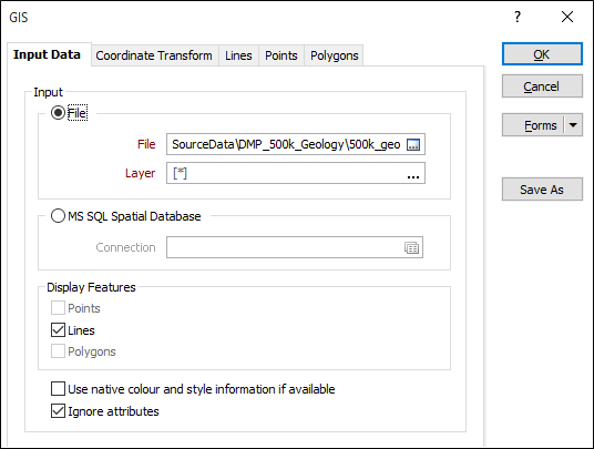 When you select an input file, one or more feature types (Lines, Points, Polygons) will be automatically selected in the Display Features group box. The selected feature types will depend on the format and content of the GIS file.