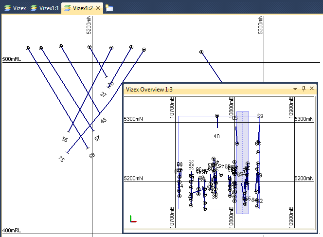 In the example below, drillholes are displayed in section. An overview window is used to show the position of the section window in Plan view.