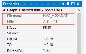 The Filename associated with the current object layer is shown at the top of the Properties pane. For DAT files, if a Filter is applied to the file, this is also shown:
