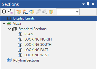 A subset of the tools on the Vizex | Sections tab, in the Section Control File group, are provided at the top of the Sections Window. You can create a new section control file, open an existing section control file, edit a section control file selected in the Sections Window, or update a named section selected in the Sections Window.