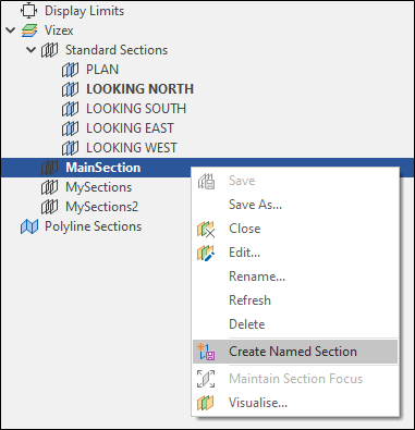 Use the Tools on the Vizex | Sections tab, in the Sections group, to set the section plane of the display, add named sections to a section control file, or step through the named sections in a section control file.