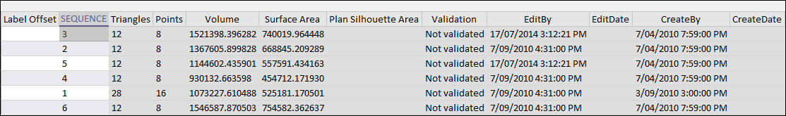 - Uneditable (greyed-out) standard attributes (Number of triangles, Number of points, Create Date, etc,) are displayed at the far right of the grid. You can use the Calculate Volume and Surfaces button to calculate Volume, Surface Area and Plan Silhouette Area attribute values.