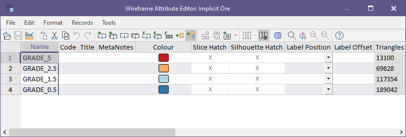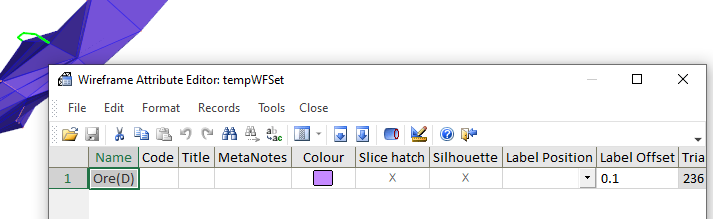 The Wireframe Attribute Editor shares much, but not all, of the functionality of the File Editor. You can Replicate attribute values (including Hatch and Colour patches), Find and Replace values and Undo and Redo your changes.