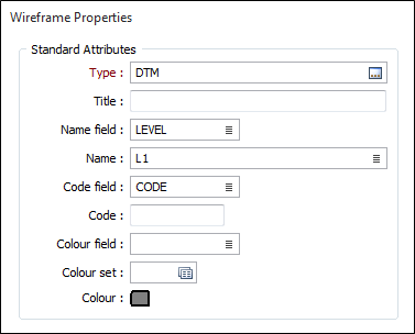 Standard attributes are always defined, no matter what type of wireframe you are dealing with. The standard attributes for each wireframe type are: Name, Code, Colour, Title, Volume, Surface Area, and Metadata (coordinate minimums and maximums, create and edit dates, etc.).