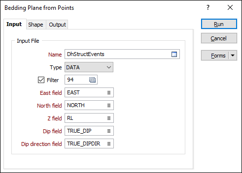 In the Bedding Plane From Points form, select the file type and double-click to select the file containing the points you want to use in the process. If required, define a filter to selectively control the records to be processed.