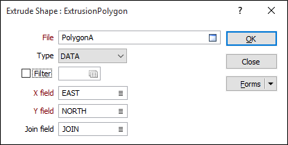 In the Extrude Shape form, specify the file and fields containing the X and Y coordinates that define the shape and optionally apply a filter to restrict the process to a subset of the records in the file.