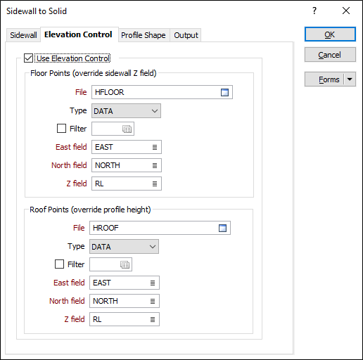 On the Elevation Control tab of the Sidewall to Solid form, you can override the settings on the Profile tab to control the roof and floor position of the generated solid.