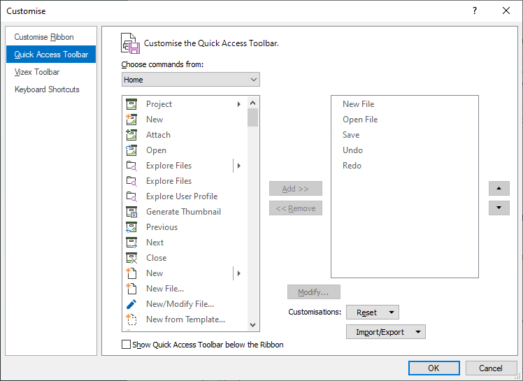 The Import/Export options are used to import customisation files created previously, or export the active customisations for later import.