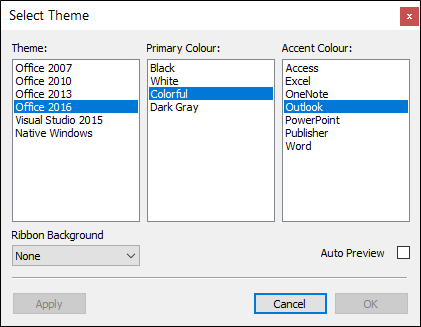 - Select a theme, a primary colour, and the accent colour. You can also set the ribbon background colour: