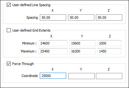 Entering user-defined values may be necessary when the line spacing and grid extents calculated automatically are not suitable for your data. Auto spacing might be too coarse, for example, and you may prefer a finer spacing.