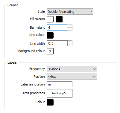 Double-click on the colour icons to select the fill colours that will be applied to the scale bar. If the chosen scale bar style is not an alternating one, then the alternate (second) colour will not be used.