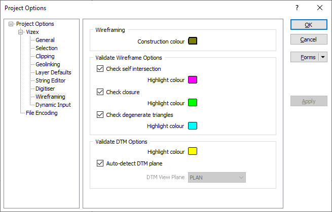 When this validation option is selected, a check is made to ensure that the triangle faces of a DTM all point roughly in the same direction and have the same sign. Select the DTM view plane that will be used for the validation. Any triangles that fail the DTM test are highlighted using the Highlight colour selected here.