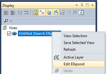 When you right-click on a Search Ellipsoid selected in the Vizex Layer Display pane, or selected in the Vizex display, an Edit Ellipsoid option allows you to interactively orient the ellipsoid in 3D using the mouse.