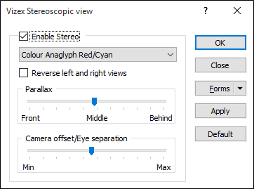 When the Enable Stereo check box option is selected, a number of settings are available in the Vizex Stereoscopic View form: