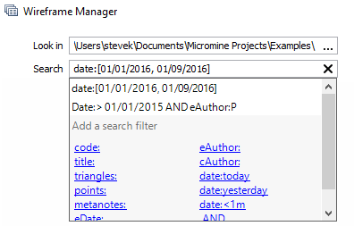 You can also enter Search keywords. Keywords (and recent searches) are available for selection when you click the mouse in the Filter box: