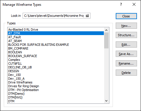 The Wireframe Types Manager allows you to view and edit the wireframe types available for selection in the current project. A Wireframe Type can be selected from any folder location. Each type is stored in its own triangulation database (*.tridb) file.