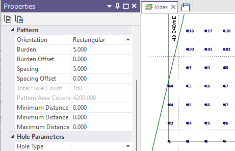 Note that the pattern object is only visible when you click inside its corresponding block or the rows or holes inside that block. Double-click the pattern to select it in order to view its properties: