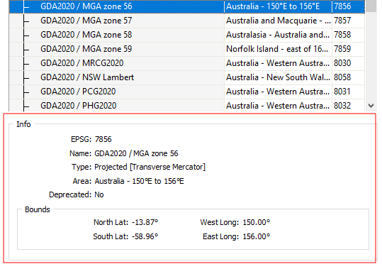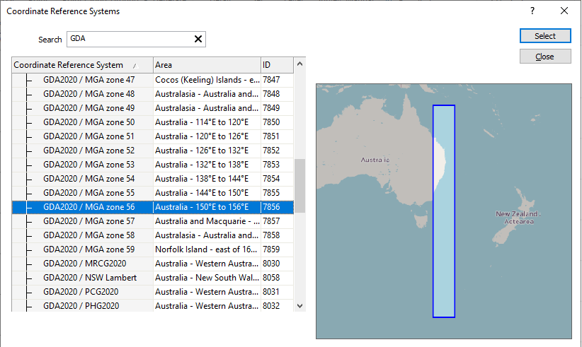 Type the ID “7856”, for example, to specifically choose GDA2020/MGA Zone 56.