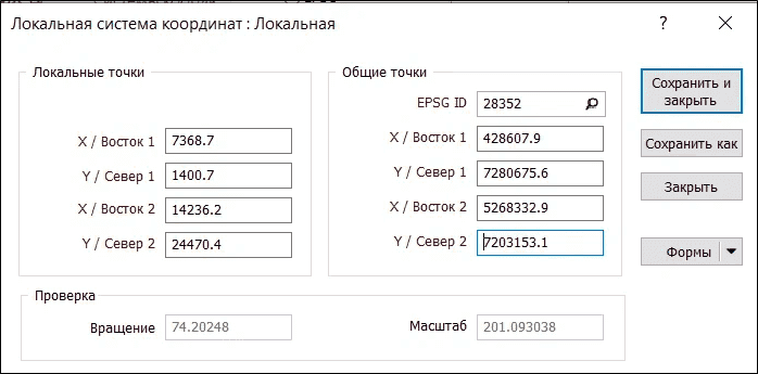 Опции Вращение и Масштаб в нижней части диалогового окна отображают разницу в северном направлении и масштабирование двух систем. Вы можете использовать это преобразование, чтобы проверить достоверность ваших вводных данных.