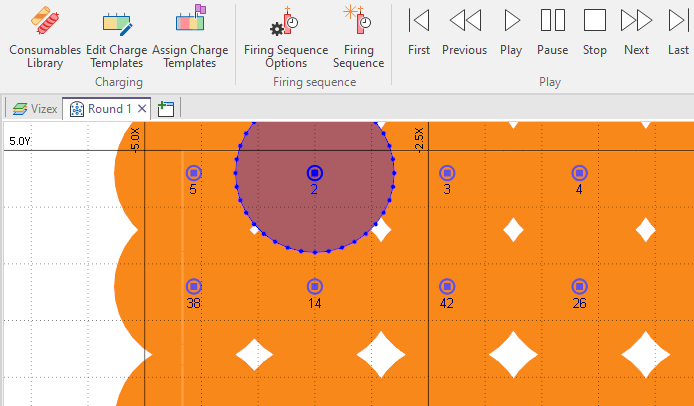 Firing sequence animation tools available on a new Charging ribbon are now available for Development Drilling layers. Используйте кнопки воспроизведения или бегунок для перемещения вперед или назад (на один шаг за раз). Скоростью анимации можно управлять, вводя значение в миллисекундах на секунду. Для перемотки анимации также можно ввести отрицательное значение. Как вариант, вы можете установить время (продолжительность) анимации.