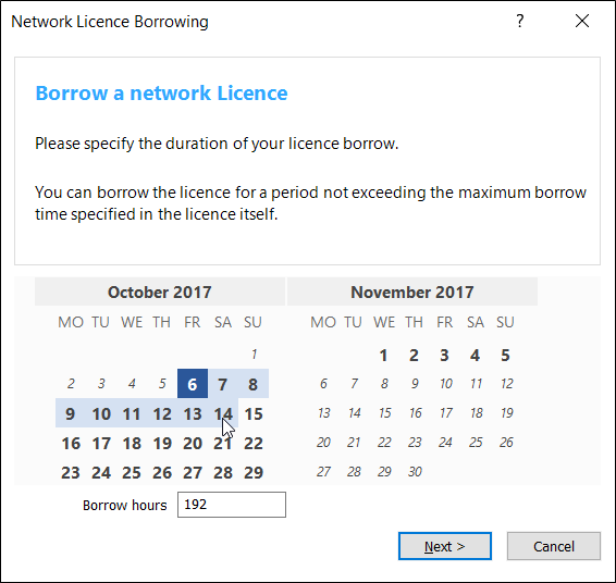 2. Если вы заимствуете лицензию, вам необходимо определить срок заимствования. Вы можете сделать это, используя календарь (даты, выделенные жирным шрифтом, это доступные даты окончания срока заимствования). Щелкните левой кнопкой мыши по желаемой дате окончания срока заимствования, на экране отобразится период заимствования.