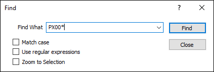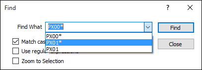 Enter the value of the search string in Find What. Any searches you make in the current session are available for selection in a drop-down History list attached to the input box. You can include wildcard characters in the search string to generalise the search.