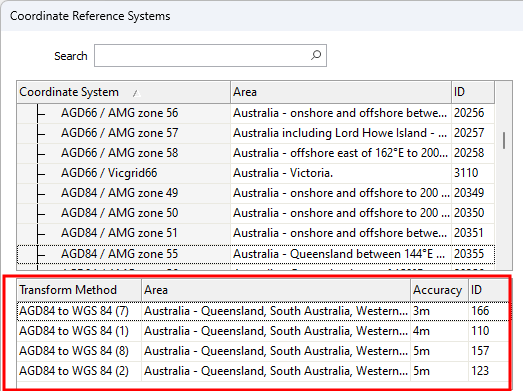 On the Survey tab, in the Coordinate Systems group, when you click New to define a new coordinate conversion and click Search to browse EPSG coordinate reference systems, you can now select a transform method for the chosen coordinate reference system: