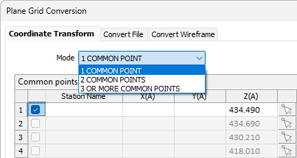 The Plane Grid Conversion tool has been updated to streamline simple conversions using one or two common points. The dialog now has a Mode option to select how many common points to use for the conversion - 1, 2, or 3 or more points.