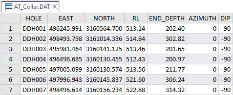 The Collar file is made up of records that describe the location of the drillhole collars and the depth of each drillhole. The Collar file is made up of records containing: