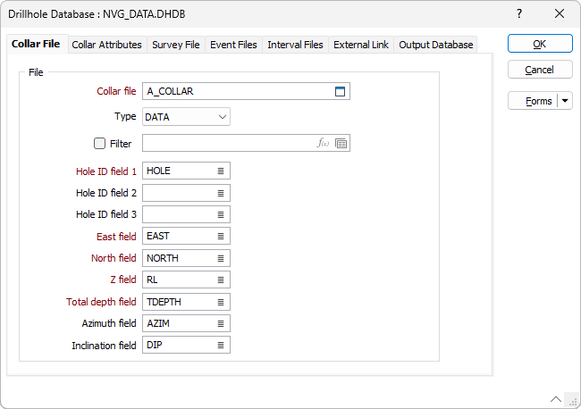 Specify a Collar file, enter field settings and optionally apply a filter to create a subset of the data in the file. The Hole field should be a field containing unique hole identifier values.