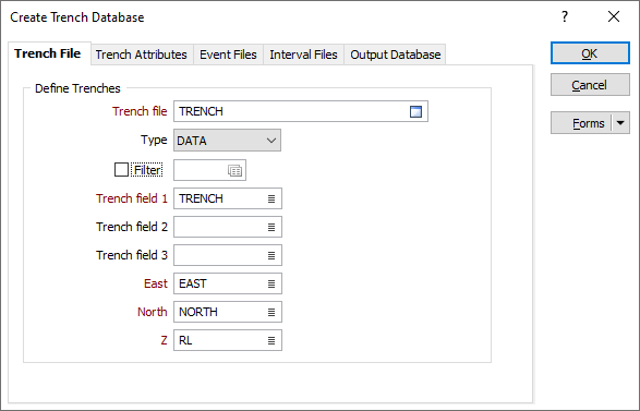 Specify the names of the fields in which Easting, Northing, and Z coordinates are stored in the Trench file.