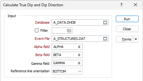 When a Gamma field is specified, the Pitch field, Lineation azimuth field and Lineation plunge field can optionally be entered to calculate the trend and plunge of the lineation.
