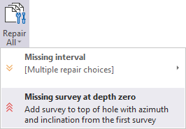 The Missing survey at depth zero repair option will add survey to the top of the hole with Azimuth and Inclination values from the first survey.