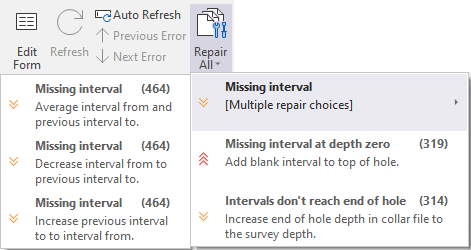 Drillhole Database Validation now supports repair of "Missing survey at depth = 0" errors, with the repair option available in the Repair All menu.
