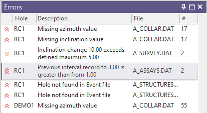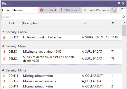 The Minor and Major severity levels have been added to Drillhole Database Validation to allow the improved categorisation of errors.