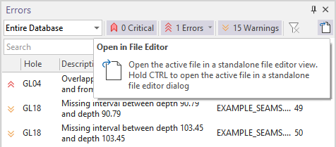 The Open In File Editor button has been added to the drillhole error viewer for Drillhole | Validation | Validate Drillhole Database.