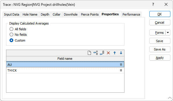 The Properties tab has been added to the Drillhole Trace and Solid Trace forms to enable the display of one or more calculated averages for the drillhole trace - All fields, No Fields or Custom.
