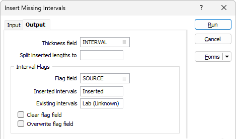 Options have been added to Insert Missing Intervals in Drillhole | Data to allow selection and configuration of a Flag field and a Split length value.