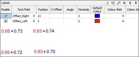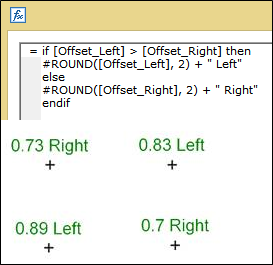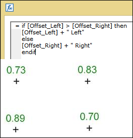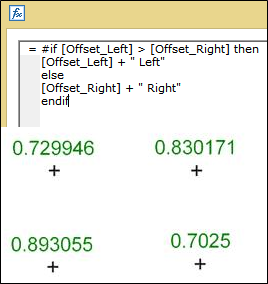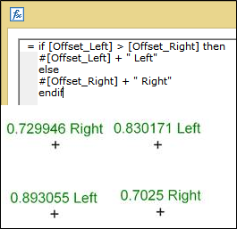 Now let’s create an expression that will display only the larger value. The intention is to create a label with the suffix “Left” or “Right”, depending on whether the left or right value is larger. So, for the top left point, we want the label to be “0.73 Right”.