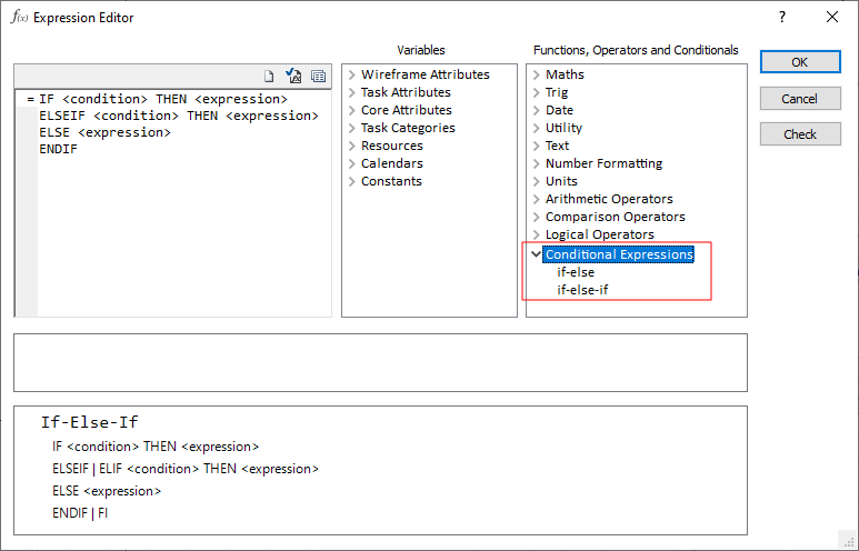 Conditional expressions are available for selection in the Expression Editor. When you click on a conditional expression, a preview is shown in the Help pane. When you double-click on a conditional expression, the expression is pasted into the editor: