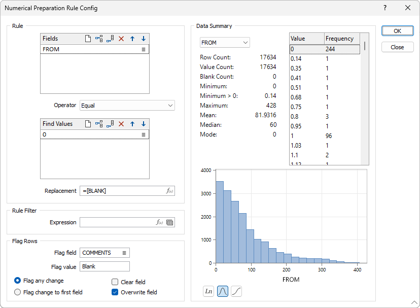 Use the Numerical Preparation tool to prepare numerical data for processing - providing the ability to inspect data and replace values across multiple fields.