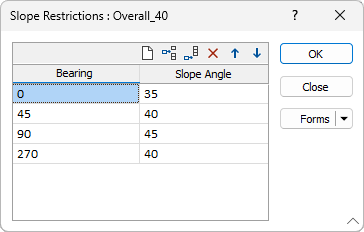 Use the Slope Restrictions dialog to define bearing and slope angle definitions for each pit slope region. Use the buttons on the local toolbar to Manage the rows in the list.