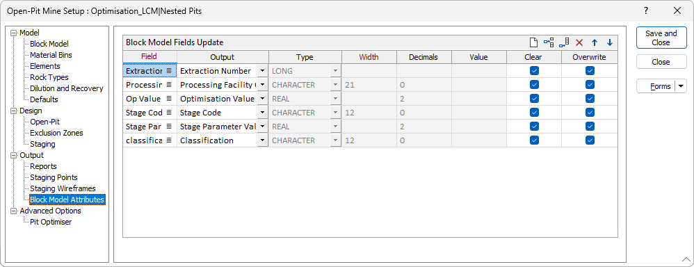 Use the Output > Block Model Attributes tab to specify fields in the block model for the mine (as specified in Mine > Definition > Model > Block Model) that are to be updated with results from the optimisation.