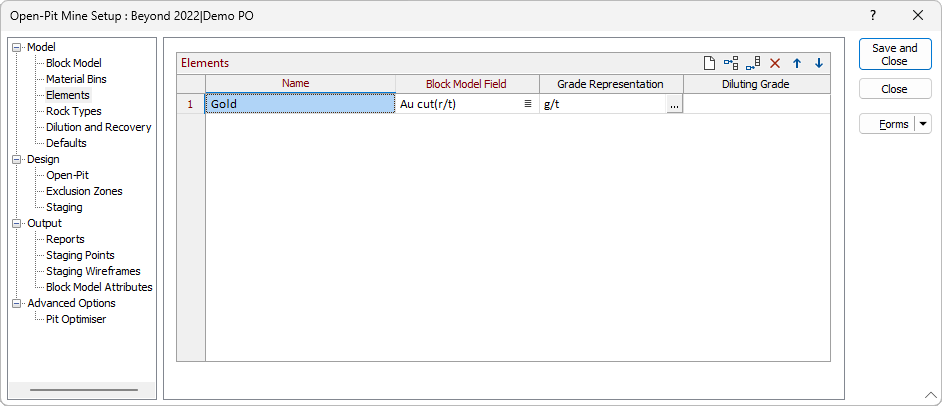 Use the Model > Elements tab to specify the list of elements produced from the mine, along with the following settings for each one: