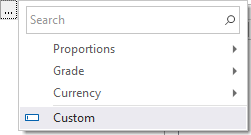 Custom units not presented in the list are accessible from the Units selection context menu, where available, by clicking the ellipse button, pressing F3 or by right clicking in the field.