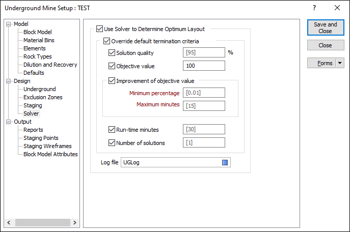 Use the Design | Solver tab to select whether the integrated mathematical programming solver is to be used to determine the optimum layout of the stopes and optional criteria for terminating the optimisation runs.