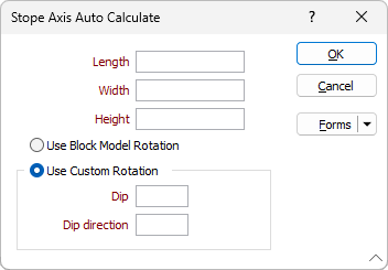If the shape of the stope is a three-dimensional (3D) rectangular prism in which the axes are perpendicular to each other, the appropriate axis lengths and orientations can be calculated and inserted automatically into the Optimisation | Stope Optimiser | Mine > Definition | Design | Underground | Stope Design | Design | Stope Axes grid list.
