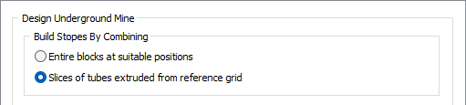 The following design parameters apply when the Build Stopes by Combining -> Slices of tubes extruded from reference grid option is selected on the Design | Underground tab of the Underground Mine Setup form.