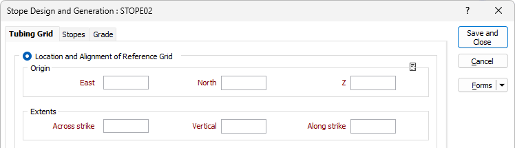 Select the Location and Alignment of Reference Grid option to configure the Origin and Extents and Reference Axes details for the stope design tubing grid.